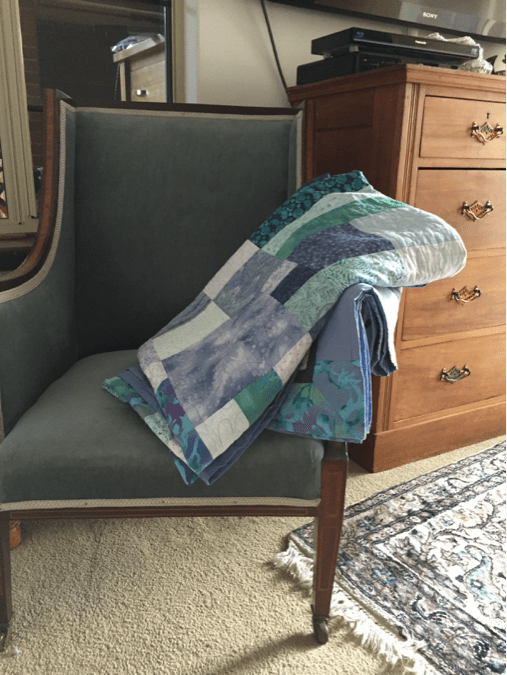 There is a quilt I made on the armchair in our bedroom awaiting a new home as we have just moved house. It caught my eye when I was thinking about this poetry assignment. Quilting and sewing have been lifelong hobbies of mine, starting in a year seven home economics class when I was given paper hexagons and scraps of 1970’s bright hued cottons. I find the visual and textural qualities of fabric as inspiring and absorbing as the sound and shape of words.