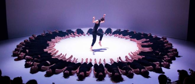 Illuminated by a single bright light overhead, black clad dancers lie in a circle on a white stage. Feet touching, arms relaxed outward above their heads, they form a complex pattern reminiscent of a mandala or a many petalled flower. As the music begins to swell, this sinuous living sculpture comes to life. Movement ripples around the circle in waves—backs arch, arms lift and fall in precise rhythmic progression. The fluidity appears effortless, belying the sheer physicality required of each performer.